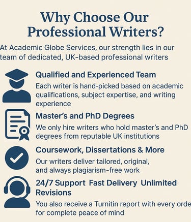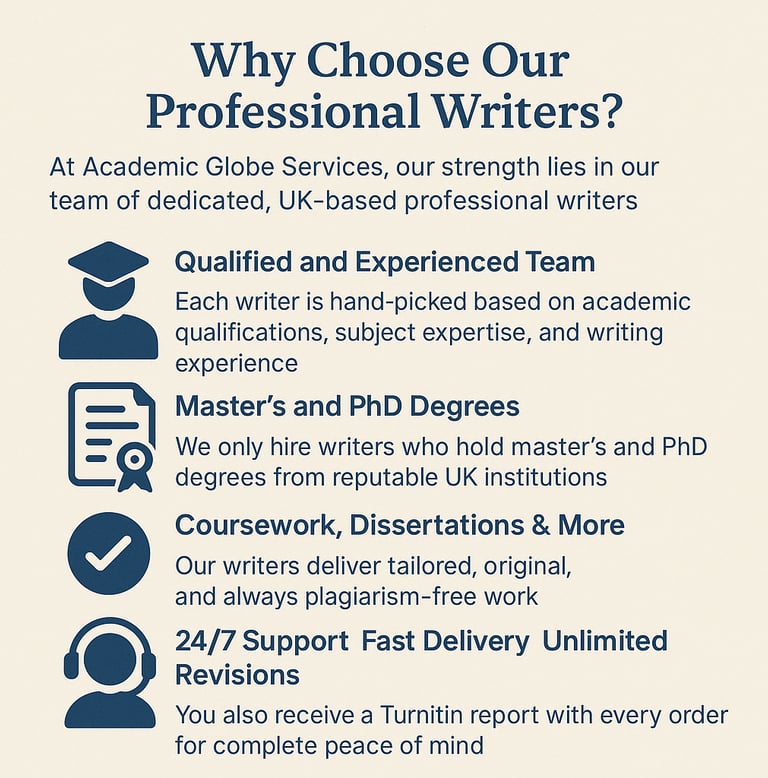 Academic Globe Services is built around a team of professional academic writers who support students across the United Kingdom. Our writers are selected for strong academic qualifications, subject knowledge and experience with UK university standards. We work with specialists across multiple disciplines who understand assessment briefs, marking criteria and referencing requirements, helping you produce work that is well structured, research informed and aligned with learning outcomes.